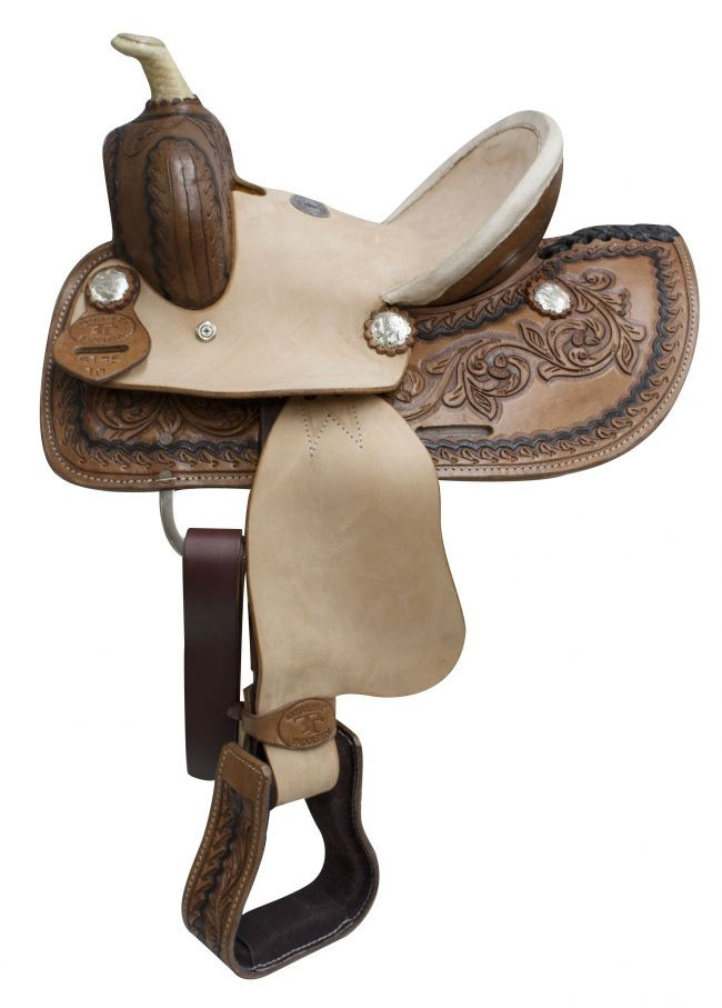 Loading... Please wait...10" Double T Youth roper style saddle with hard seat. This saddle features a floral tooled medium skirt accented with silver conchos and a full roughout hard seat and rough out fenders. Saddle comes equipped with leather latigo and off billet.