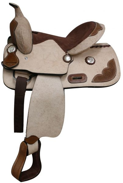 Loading... Please wait...13" Pony/ Youth Rought Out Leather Saddle with Tooled leather accents. This saddle features rough out leather with basket weave tooled leather accents on skirts, pommel, and cantle. This saddle is accented with engraved silver conchos and brown suede leather seat. Saddle comes equipped with nylon off bullet and tie strap.
