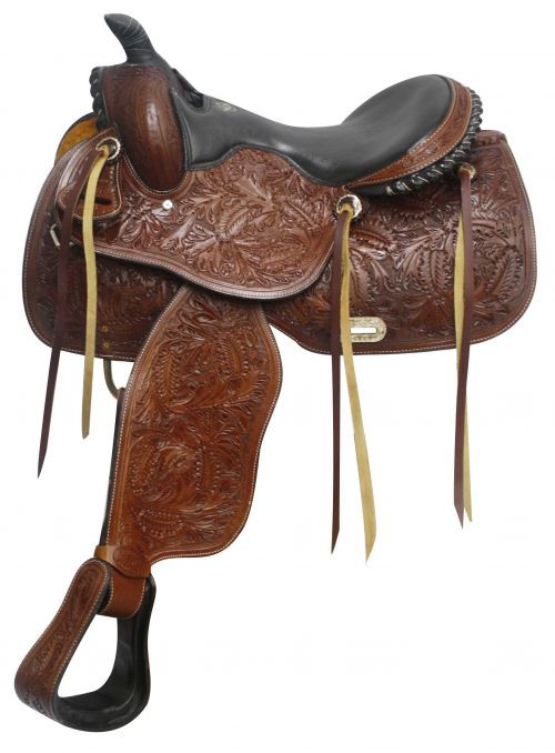 Loading... Please wait...16", 17" Double T Fully Tooled Pleasure Saddle. This saddle features fully tooled leather with silver laced rawhide cantle and pomme. Top grain leather seat and leather wrapped horn. This saddle is accented with engraved silver back rigging and two toned leather strings on skirts. Saddle comes equipped with fron D rings, leather latigo tie strap and off billet. Made by Double T Saddlery. FREE SHIPPING TO USA!