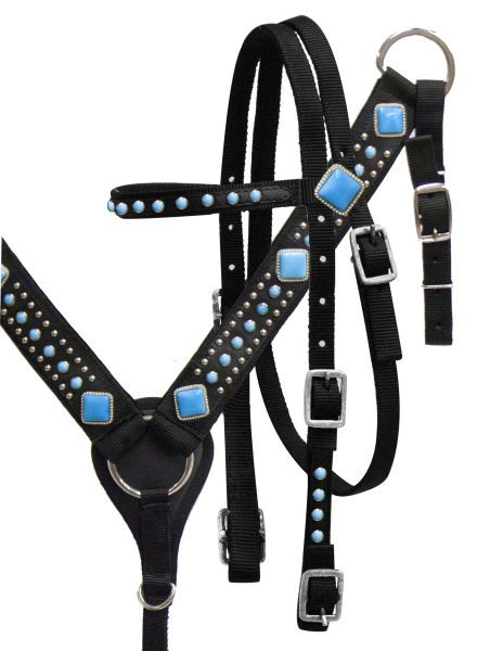 Showman Horse Size nylon headstall and breast collar set with turquoise stone conchos. This headstall and breast collar set feature 2 ply black nylon with black overlay accented with turquoise stone conchos and studs. Adjustable cheeks with hook and loop ends. Breast collar is lined with soft neoprene. Headstall comes with matching nylon conway buckle reins