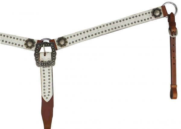 This breast collar feature cream and silver filigree print overlay accented with engraved brushed nickel rosette conchos and large belt style buckle in center. 1.5" wide!