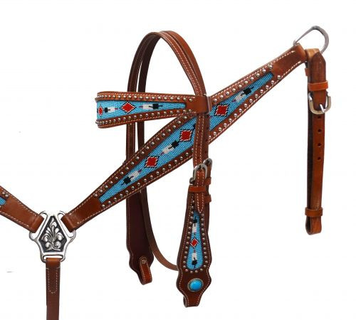 Loading... Please wait...Showman Headstall and breast collar set with beaded inlays. This set features medium oil leather with a turquoise beaded inlay with feather and diamond design on wide browband and cheeks and are accented with silver studs. Bit loops are accented iwith large turquoise stone conchos. Headstall comes with 5/8" x 7'