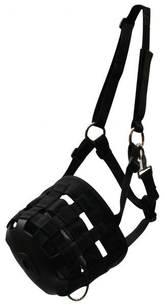 Showman adjustable nylon grazing muzzle with throat latch. This muzzle is made of nylon with nickle plated hardware and features a rubber base. Double velcro closure makes this muzzle easy to adjust and provided added security and comfort. The muzzle is lined with neoprene around the nose for added comfort. This muzzle features a large D- ring underneath. The rubber base is durable and features a 1" opening in the center to allow the horse to drink easily yet, limits grass intake. Muzzles are great for horses with obesity, laminitis, founder and to help prevent wood chewing. Measures aprox 23" to 26" from crown to base of muzzle.