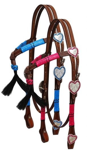 Showman leather futurity knot headstall with rawhide braiding. This headstall features colored rawhide braiding on cheeks and futurity knot brow band with horse hair tassels. Engraved heart shape conchos and buckles are accented with colored rhinestone studs.