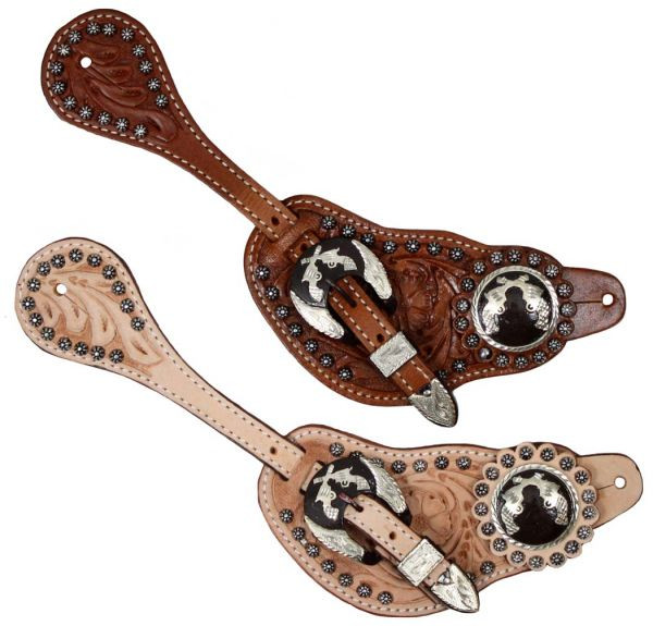 Showman™men's size floral tooled leather spur straps. Spur straps are accented with small silver studded beads and feature silver engraved crossed pistol conchos