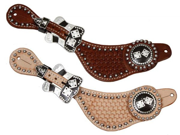 Showman™men's size waffle pattern tooled leather spur straps. Spur straps are accented with silver beads and feature silver engraved dice conchos.
