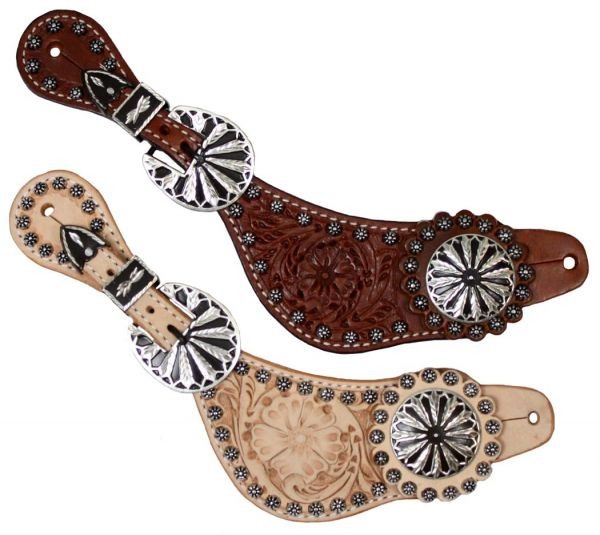 Showman™women's size floral tooled leather spur straps. Spur straps are accented with small silver studded beads and feature silver engraved starburst conchos